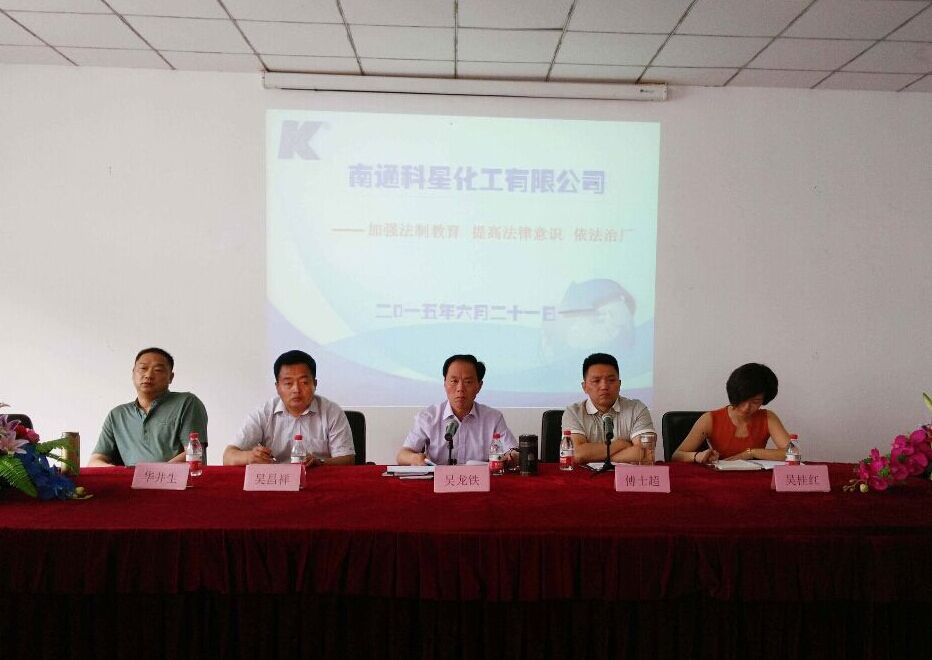 為了提高全體員工遵章守法的意識(shí),依法治廠,南通科星化工有限公司于2015年6月21日上午在公司南廠區(qū)會(huì)議室對全體員工進(jìn)行了“加強(qiáng)法制教育,提高法律意識(shí),依法治廠”的教育主題活動(dòng)。會(huì)上,董事長吳龍鐵在報(bào)告中指出:“黨的十八大四中全會(huì)習(xí)總書記提出依法治國的大政方針”,作為我們企業(yè),在進(jìn)行管理中必須嚴(yán)格遵守國家法律法規(guī),每個(gè)員工都要嚴(yán)格執(zhí)行公司十六項(xiàng)規(guī)章制度和員工手冊,人人做安全生產(chǎn)、環(huán)境保護(hù)等各項(xiàng)法律法規(guī)的守護(hù)神。