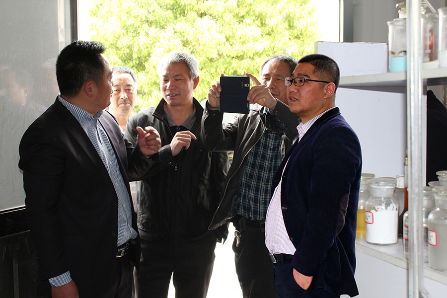 科星化工銷售總監(jiān)吳昌祥(左一) 在理化室,與五洲新春集團領(lǐng)導(dǎo)著重介紹了在生產(chǎn)過程中如何對貨品取樣抽檢,以及對品質(zhì)全程把控的工序流程。富日泰俞總(右二)裘廠長(左二)森春有限公司陳總(右一)李總(右三)