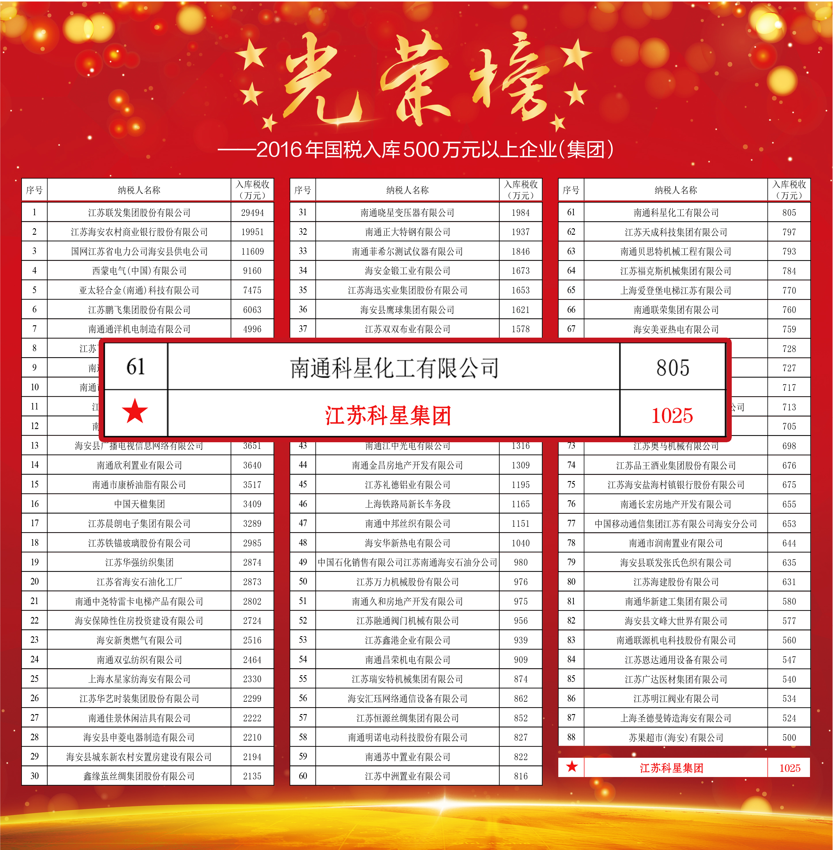 2016年,在縣委縣政府和南通市國稅局的正確領導下,江蘇科星集團暨南通科星化工有限公司實現(xiàn)集團公司稅收超千萬,堅持以環(huán)保、安全、消防、質(zhì)量、節(jié)能、高效的經(jīng)營理念,取得了驕人業(yè)績。