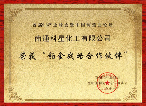 5G產(chǎn)業(yè)峰會暨中國制造業(yè)論壇組委會為南通科星化工有限公司授予“鉑金戰(zhàn)略合作伙伴”的榮譽。
