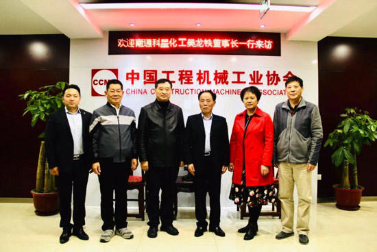 2020年11月12日南通科星化工有限公司董事長(zhǎng)吳龍鐵(右三)、原山東重工集團(tuán)總經(jīng)理助理高級(jí)顧問顏開榮(左二)、南通科星化工有限公司總經(jīng)理傅士超造訪中國工程機(jī)械協(xié)會(huì),中國工程機(jī)械協(xié)會(huì)常務(wù)副會(huì)長(zhǎng)兼秘書長(zhǎng)蘇子孟(左三)和中國工程機(jī)械工業(yè)協(xié)會(huì)副秘書長(zhǎng)尹曉荔(右二)親切接待