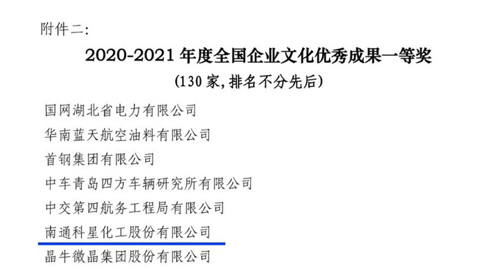 南通科星化工股份有限公司獲全國(guó)企業(yè)文化優(yōu)秀成果一等獎(jiǎng)