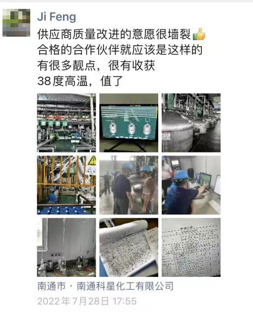 座談會之后,麥格納考察團一行對科星的生產(chǎn)車間、中控室、倉庫等現(xiàn)場進行了查看,進一步加深了對科星生產(chǎn)流程、作業(yè)現(xiàn)場等方面的了解,科星相關(guān)部門負責(zé)人就考察團提出的安全評估、環(huán)境監(jiān)測及6S管理問題進行了現(xiàn)場解疑答惑。