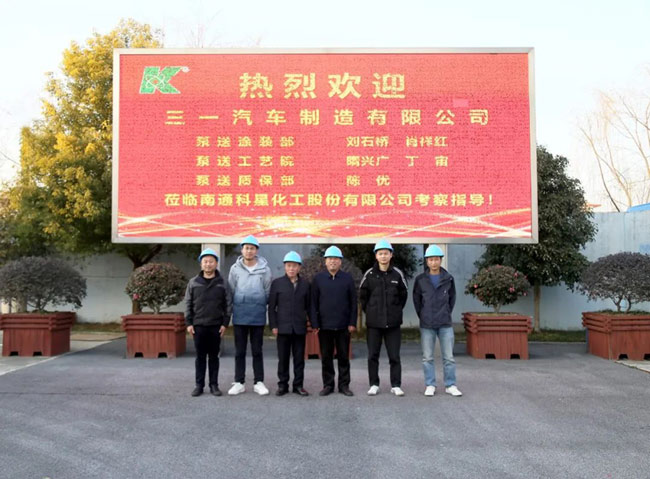 2023年2月20日,三一汽車制造有限公司泵送涂裝部劉石橋、肖祥紅,工藝部隋興廣、丁宙,質(zhì)保部陳優(yōu)蒞臨江蘇科星新材料暨南通科星化工股份有限公司考察指導(dǎo),科星董事長吳龍鐵、銷售經(jīng)理李春華熱情接待。