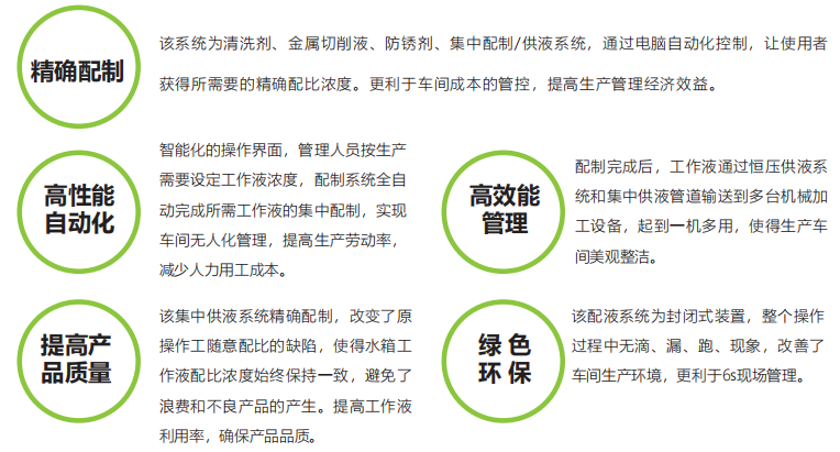 該配制/供液系統(tǒng)通過電腦精準(zhǔn)控制,使工作液配比濃度始終保持一致,避免浪費和不良品的產(chǎn)生,解決了國內(nèi)外機械加工制造企業(yè)存在的單機工作液配制繁瑣,費時費工,配比不精確的弊端。使用戶一機多用地進行數(shù)種加工液同時、準(zhǔn)確、安全、自動化配制,具有廣泛應(yīng)用的效果。